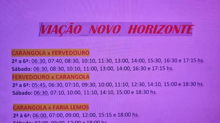Vindo de Carangola para Fervedouro a viagem dura cerca de 40 minutos segundo ressaltou a direção da empresa Novo Horizonte. Até chegar à Miradouro são cerca de 1 hora e 10 a partir do horário de saída.