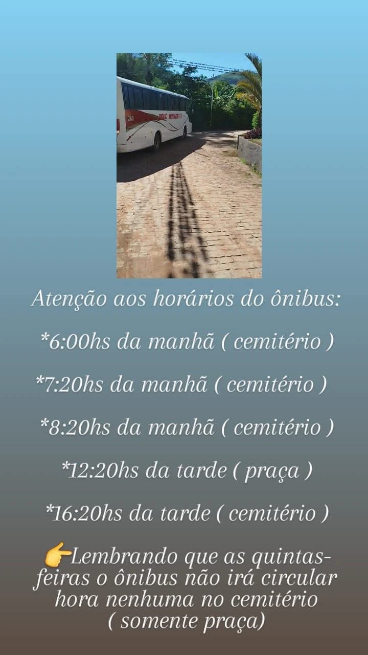 A novo horizonte comunica que o ÔNIBUS DA LINHA CARANGOLA A PONTE ALTA. VAI ESTAR PEGANDO PASSEIRO ATE O PONTE FINAL.(Perto do cemitério)no horário normal…
