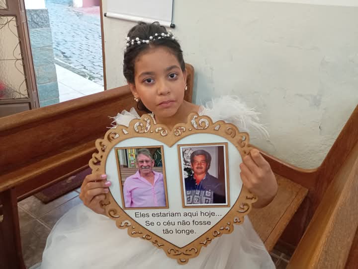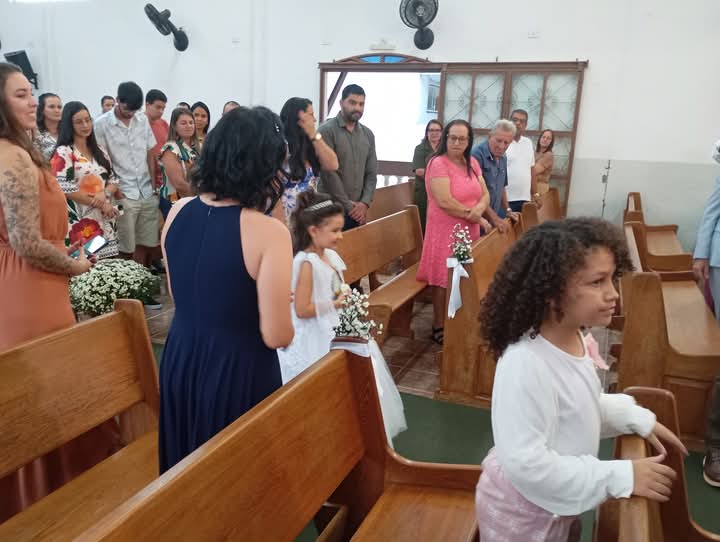 Outro momento muito emocionante foi quando uma criança entrou na igreja carregando uma arte em forma de coração, dentro a foto do pai da noiva ( senhor Chico Rosa, falecido em 22/11/24 e também do pai do noivo, o senhor Fusquinha já falecido a 13 anos) com uma descrição: ” Eles estariam aqui hoje… Se o céu não fosse tão longe.”.