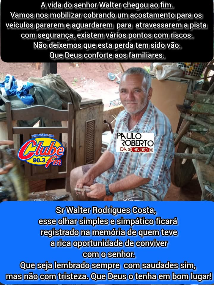 Na manhã deste sábado 24/05/25, ocorreu um acidente na BR 116, na região da Graminha, onde tirou a vida do senhor Valter Rodriguês Costa, de 58 anos de idade, pai do nosso amigo Marcos, morador da localidade, que fica a cerca de 3 a 4 Km do ocorrido.