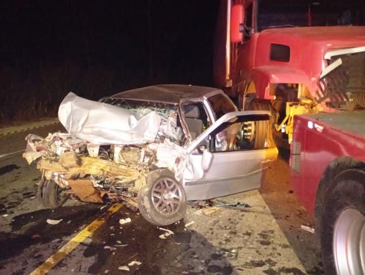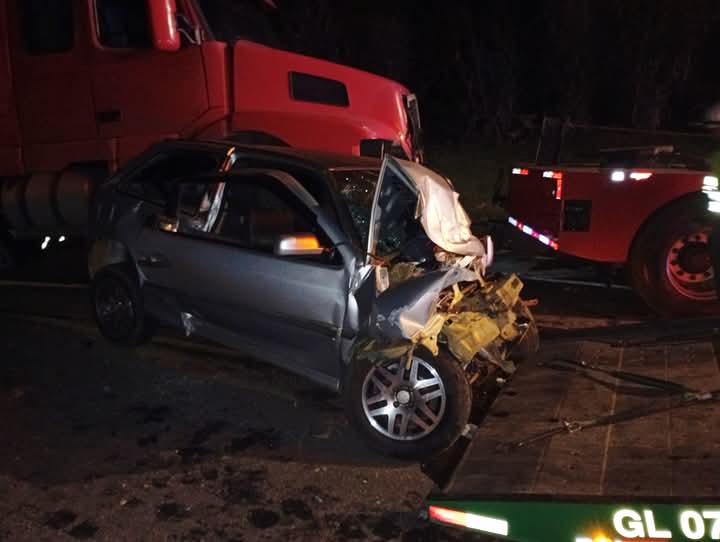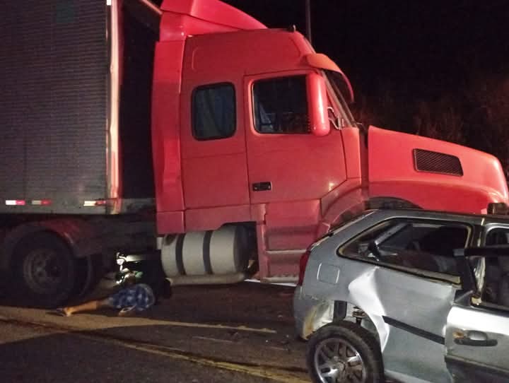 Segundo o carreteiro o carro teria invadido a contra mão e ele teria tentado tirar, mas não conseguiu evitar o impacto.