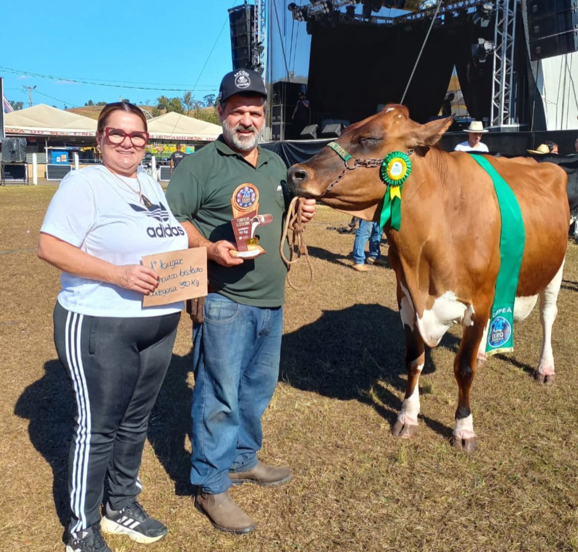 Flávio e sua irmã Fernanda da fazenda Santa Rita, de Fervedouro, estão muito felizes, pois sua vaca Jady, ficou em primeiro lugar no concurso leiteiro na categoria 30 kilos na exposição agropecuária de Carangola este ano. Parabéns!