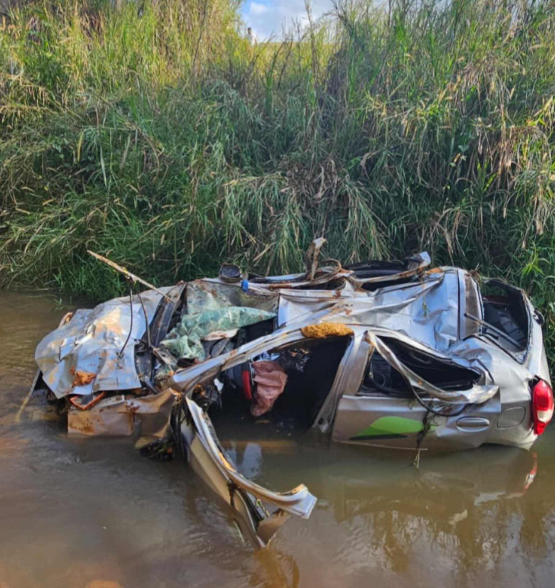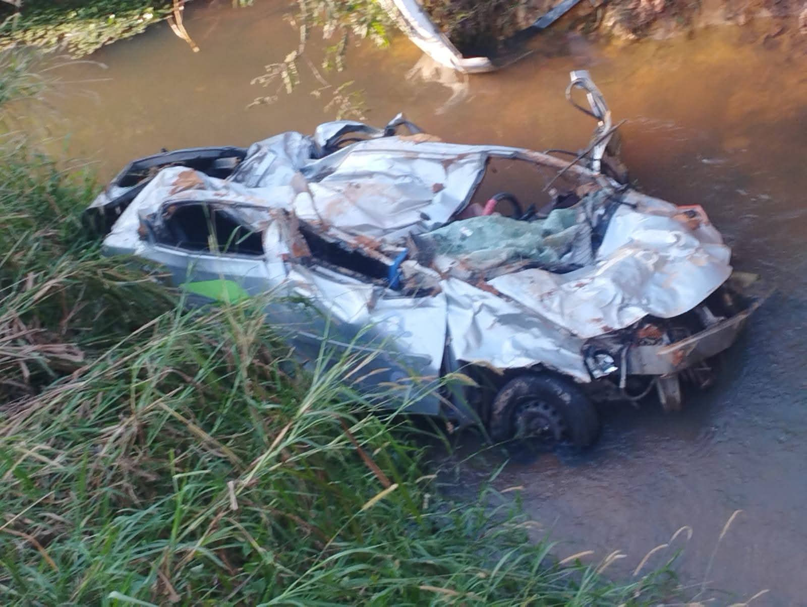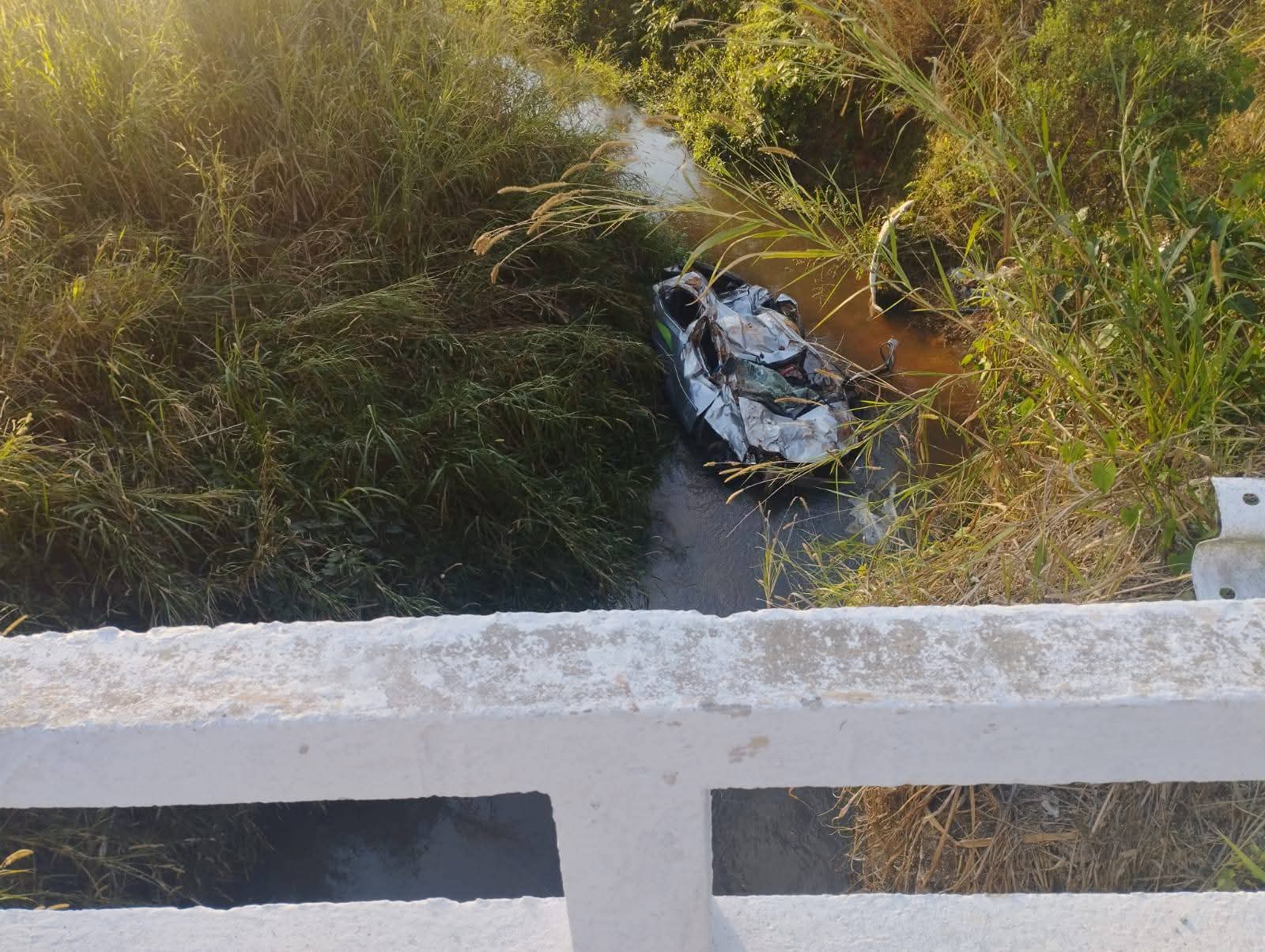 Um automóvel ToyotaEtios, pertencente a uma empresa de distribuição de alimentos, caiu de uma ponte de aproximadamente 10 metros de altura, em um local conhecido como Curva do Dólar.