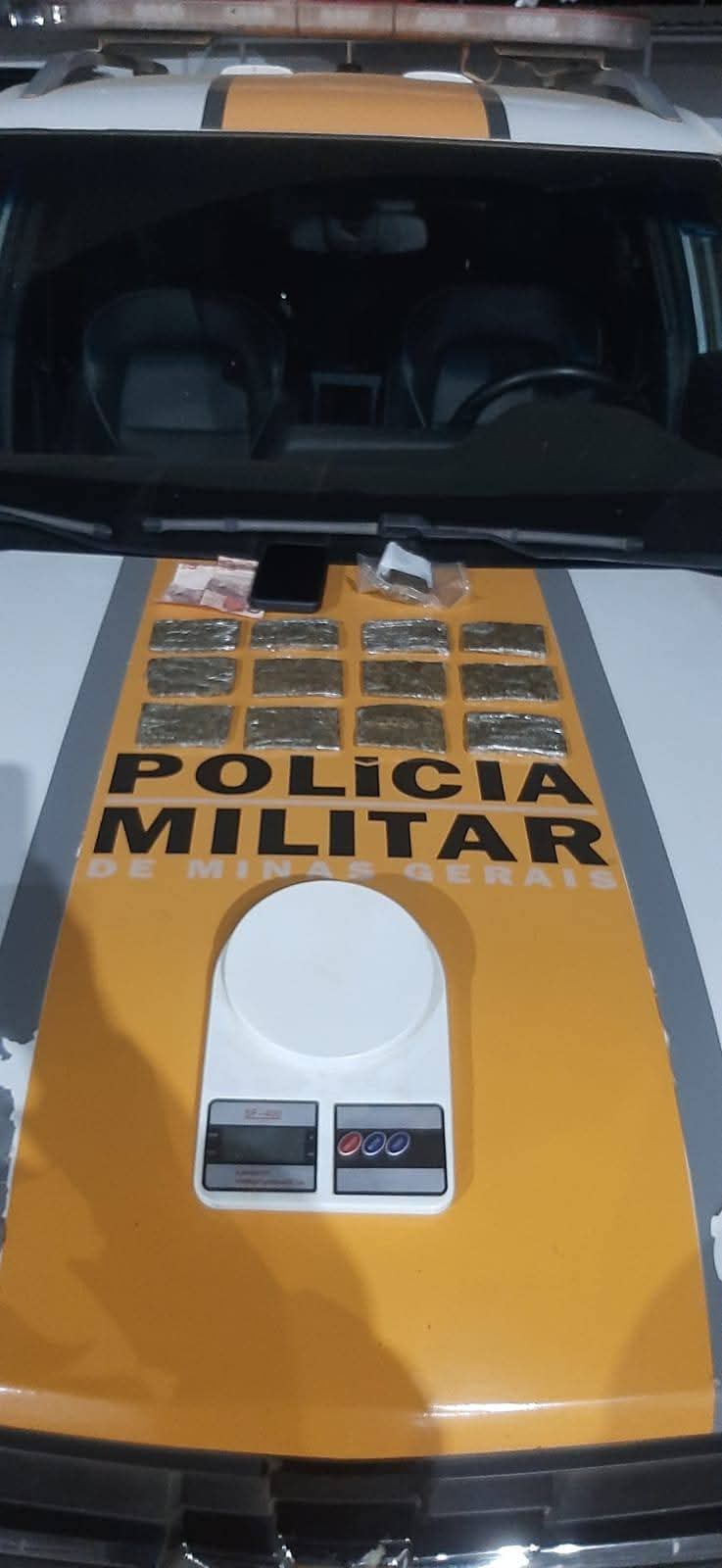 Também foi apreendido um aparelho celular, vinte reais em moeda corrente, e uma balança de precisão.