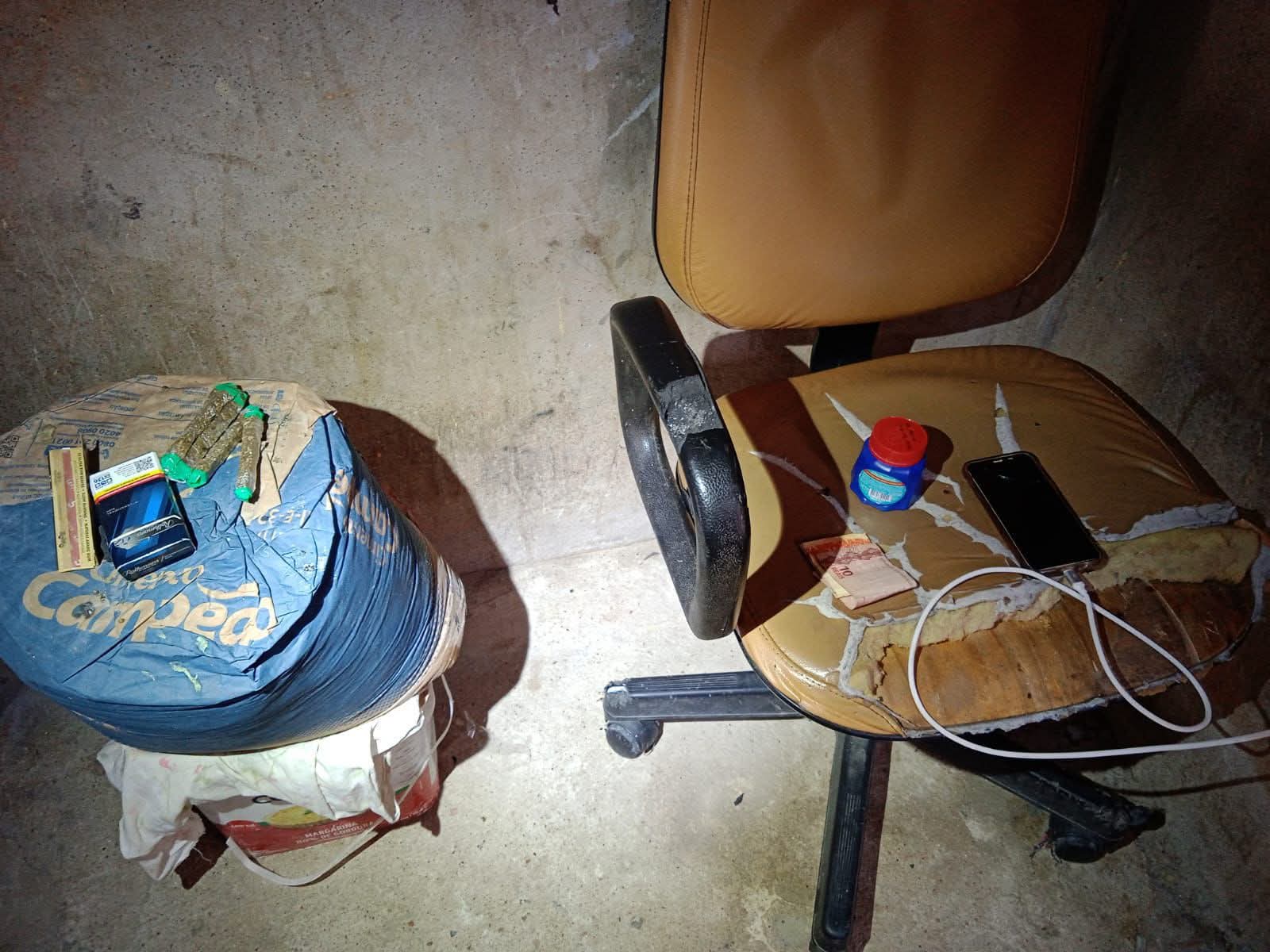 – 19 papelotes de cocaína – 18 porções de maconha, incluindo tabletes – R$ 45,00 em dinheiro – 1 aparelho celular