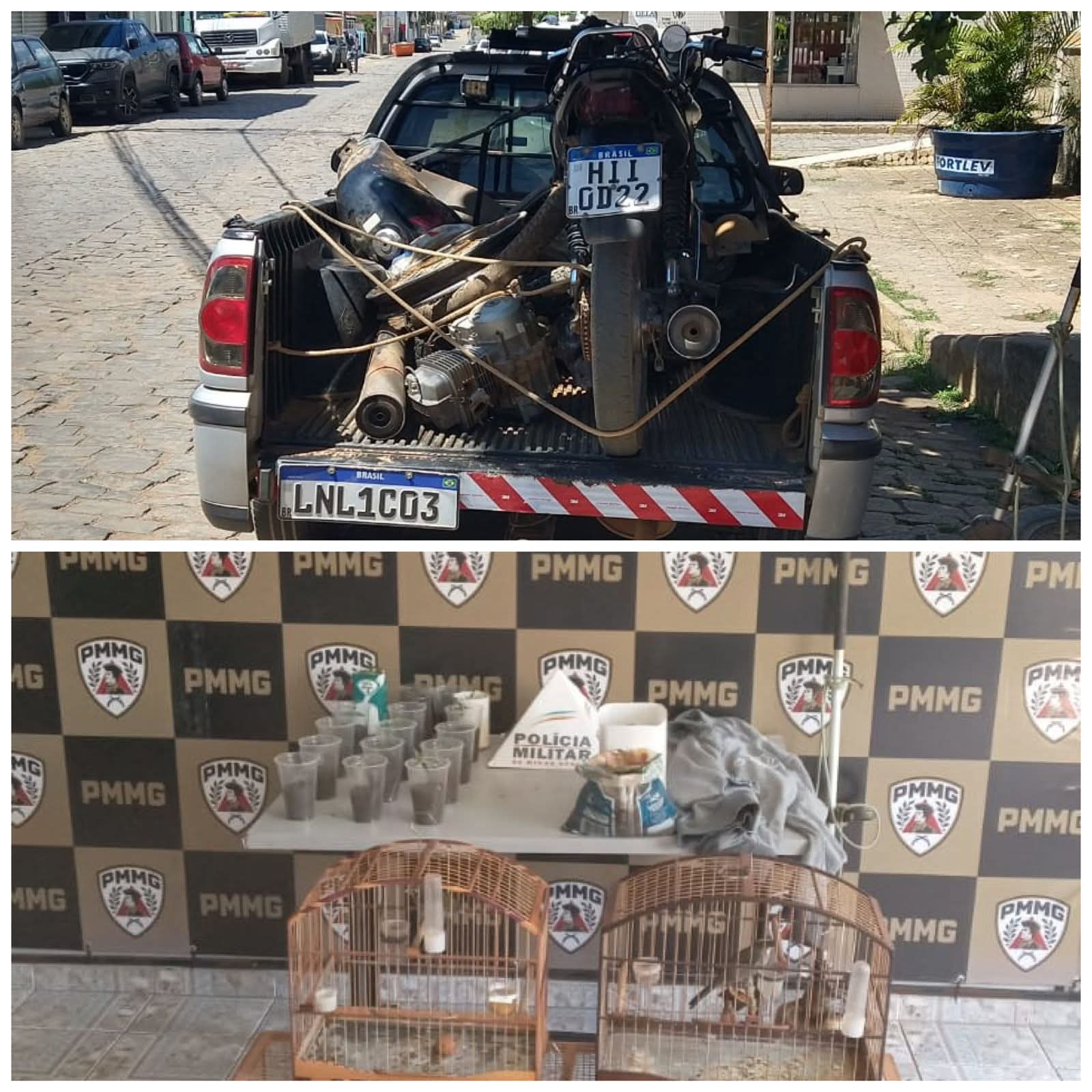 * 01 Motocicleta (utilizada para a prática do furto)- 01 Motocicleta (produto de furto)- 18 recipientes com 24 pés de maconha- 5 pássaros da fauna silvestre em cativeiro- 01 Aparelho celular- Uma blusa usada no crime.