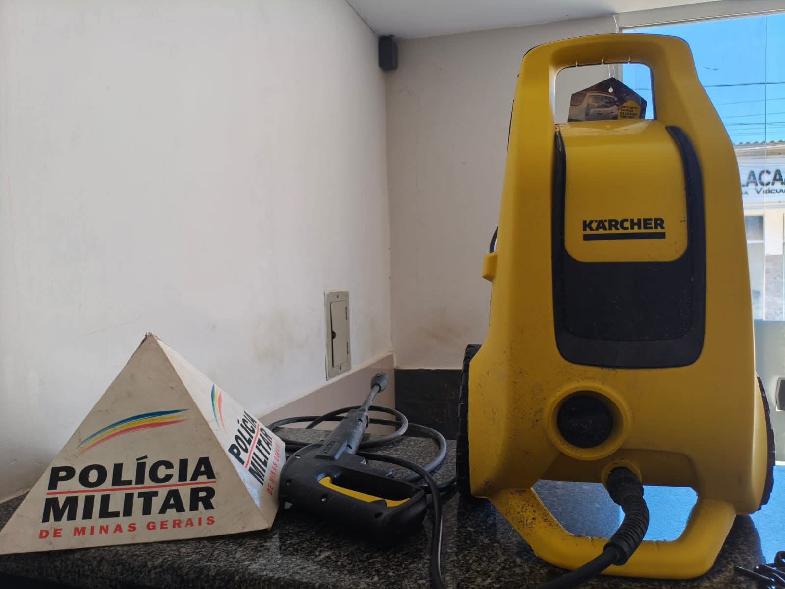 A PMMG iniciou o rastreamento imediatamente. O autor foi localizado no Bairro Santo Antônio, de posse da máquina furtada (uma Máquina de Alta Pressão da marca Karcher, de cor amarela).
