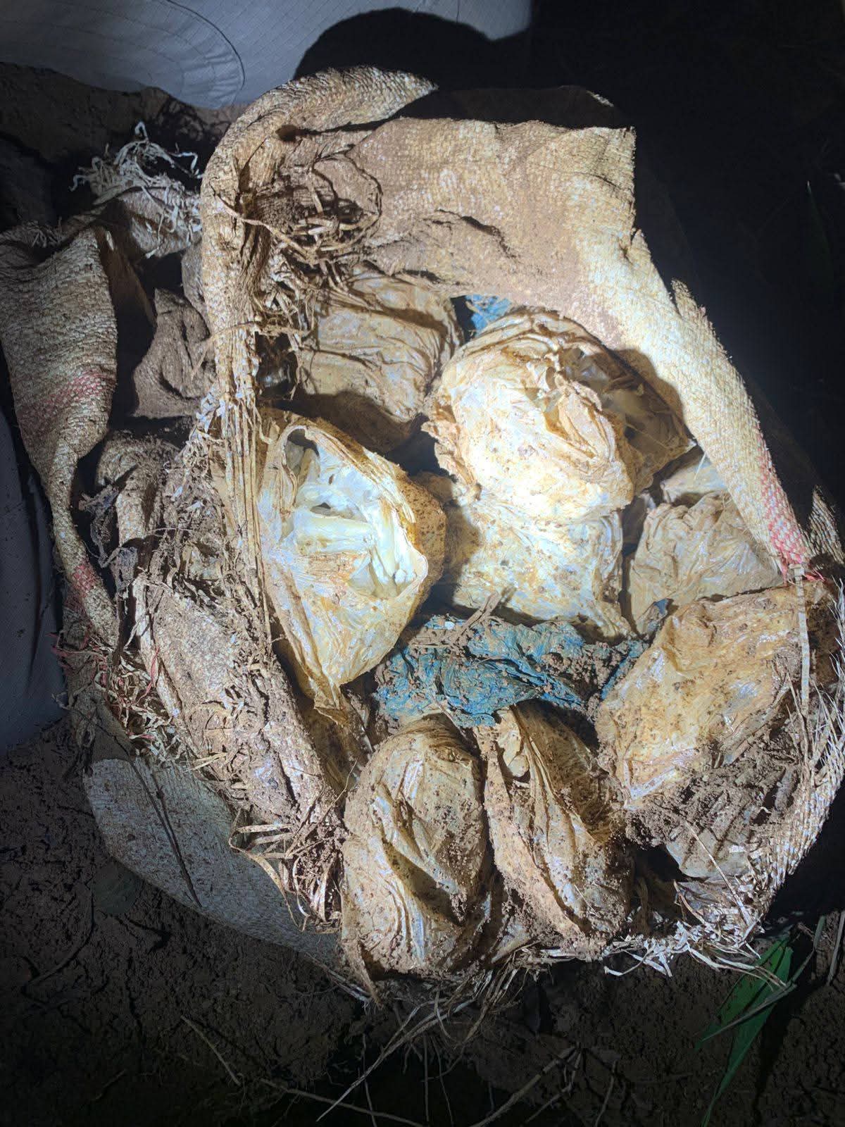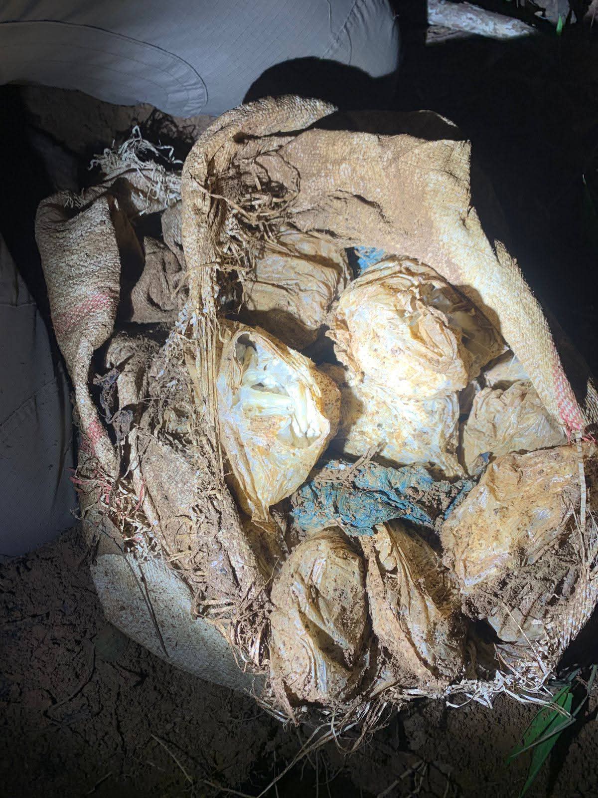 Durante as buscas na região de mata, o cão Percy indicou um local onde foi encontrado um saco de fibra enterrado. Dentro do saco, os militares localizaram uma expressiva quantidade de pinos de cocaína.