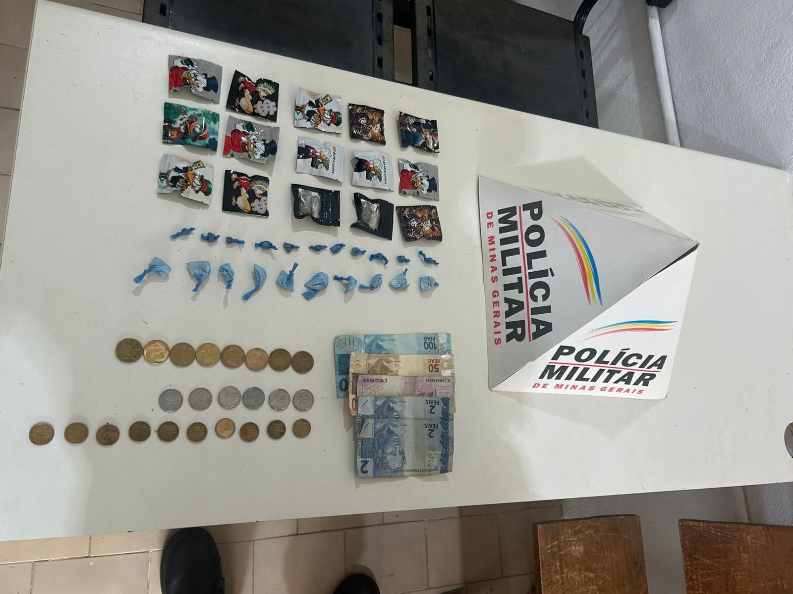 – 15 invólucros de maconha – 11 pedras de crack – 10 papelotes de cocaína e – R$ 165,00.