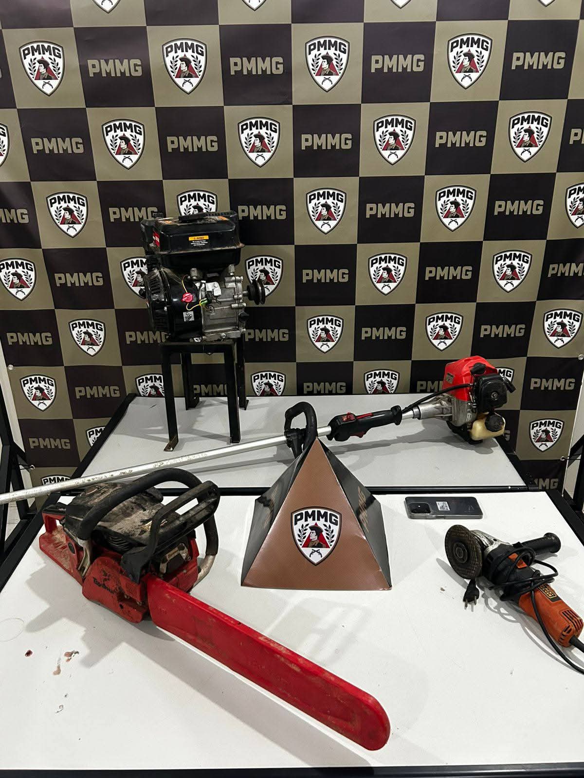 Foram 02 Autores presos (um por desobediência/suspeita de furto e outro por receptação); 01 Motosserra marca Toyama recuperada; 01 Roçadeira marca Nakashi recuperada; 01 Esmerilhadeira marca Black & Decker recuperada; 01 Gerador à combustão marca Kawashima recuperado; 01 Veículo (Fiat Palio) apreendido; 01 Telefone celular apreendido.