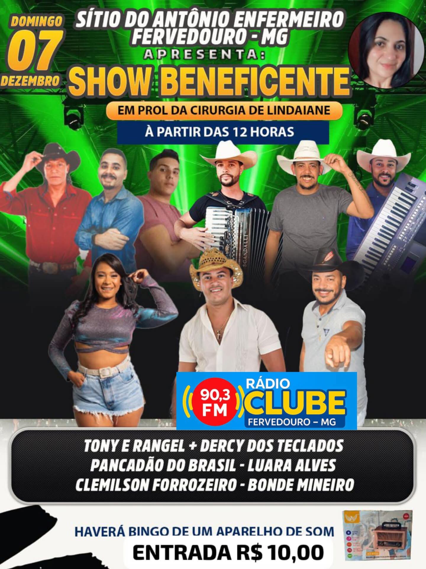 Entrada 10 reais com direito a cartela de um bingo de vários prêmios, cartela cheia, um som de casa.