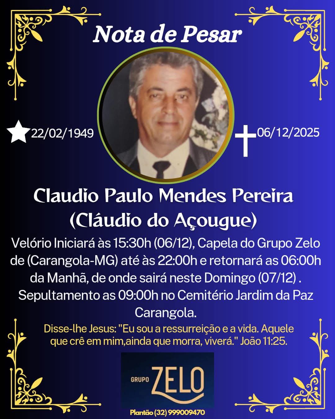 Sem categoria FALECEU CLAUDIO PAULO MENDES PEREIRA ( CLÁUDIO DO AÇOUGUE) DE CARANGOLA 6 de dezembro de 2025 0 Post Views: 0