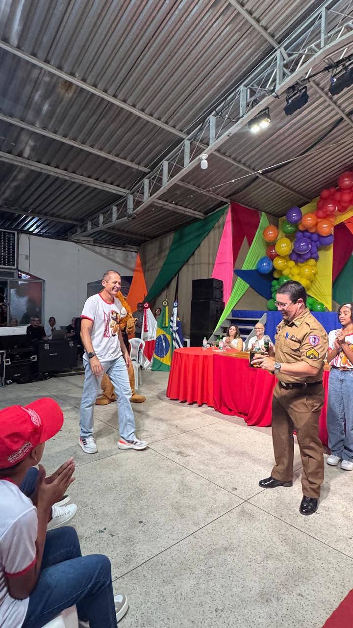Sob aplausos, música e muita empolgação, as 17 turmas entraram no salão carregando o orgulho de tudo o que aprenderam ao longo do semestre. À frente desta grande missão esteve o Sargento PM Vital, instrutor do PROERD da 75ª Cia PM, cuja dedicação, carisma e forma lúdica de ensinar conquistaram as crianças e transformaram cada aula em uma experiência marcante. Seu trabalho foi exaltado por todos e reconhecido como parte essencial do sucesso da formatura.