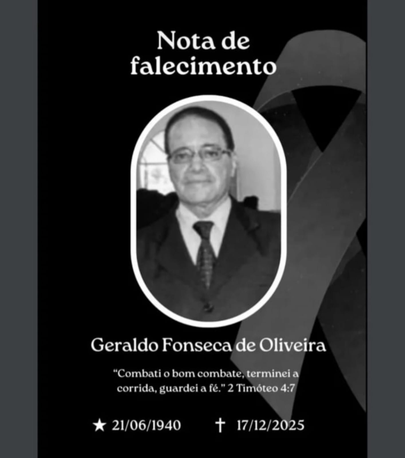A filha Lenilda, os netos Leonardo, Leandro e Tiago, sobrinhos, esposa Zenite e demais familiares, cumprem o doloroso dever de comunicar o falecimento de Geraldo Fonseca de Oliveira.
