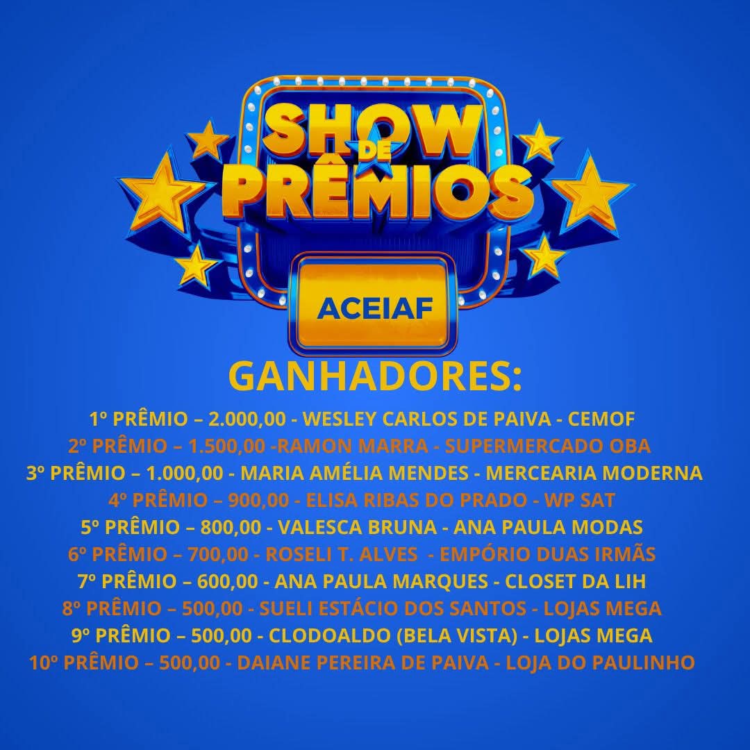 Os ganhadores deverão retirar o vale compras na sede da ACEIAF, de segunda a sexta , no horário de 13:00 às 17:00 horas. Para mais informações entre em contato (32) – 98482 2961