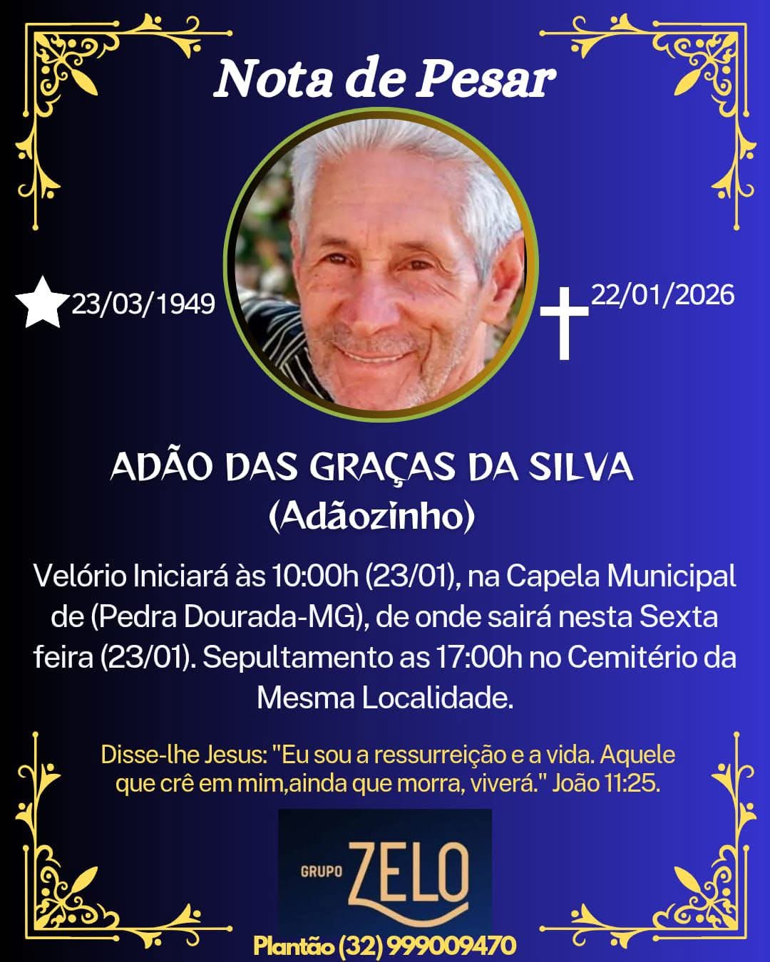 Sem categoria FALECEU ADÃO DAS GRAÇAS DA SILVA ( ADÃOZINHO) DE PEDRA DOURADA 23 de janeiro de 2026 0 Post Views: 0