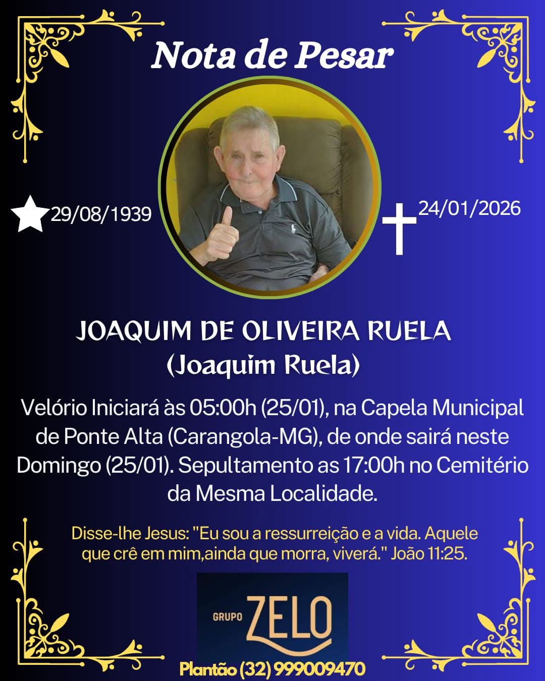 Sem categoria FALECEU JOAQUIM DE OLIVEIRA RUELA (JOAQUIM RUELA ) DE CARANGOLA 25 de janeiro de 2026 0 Post Views: 0