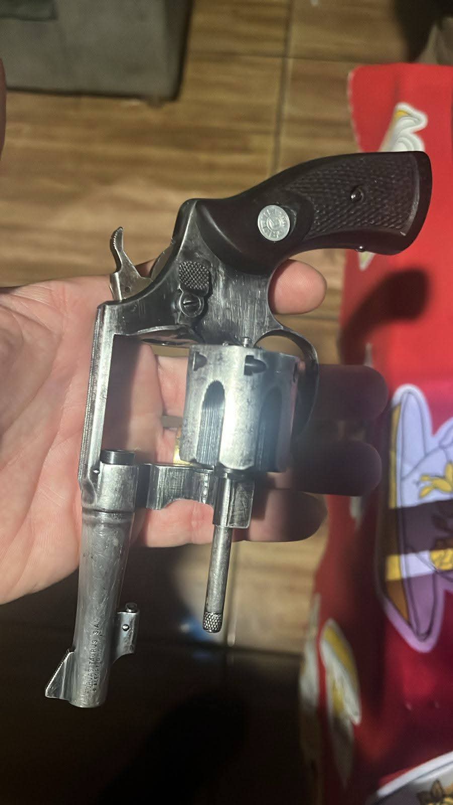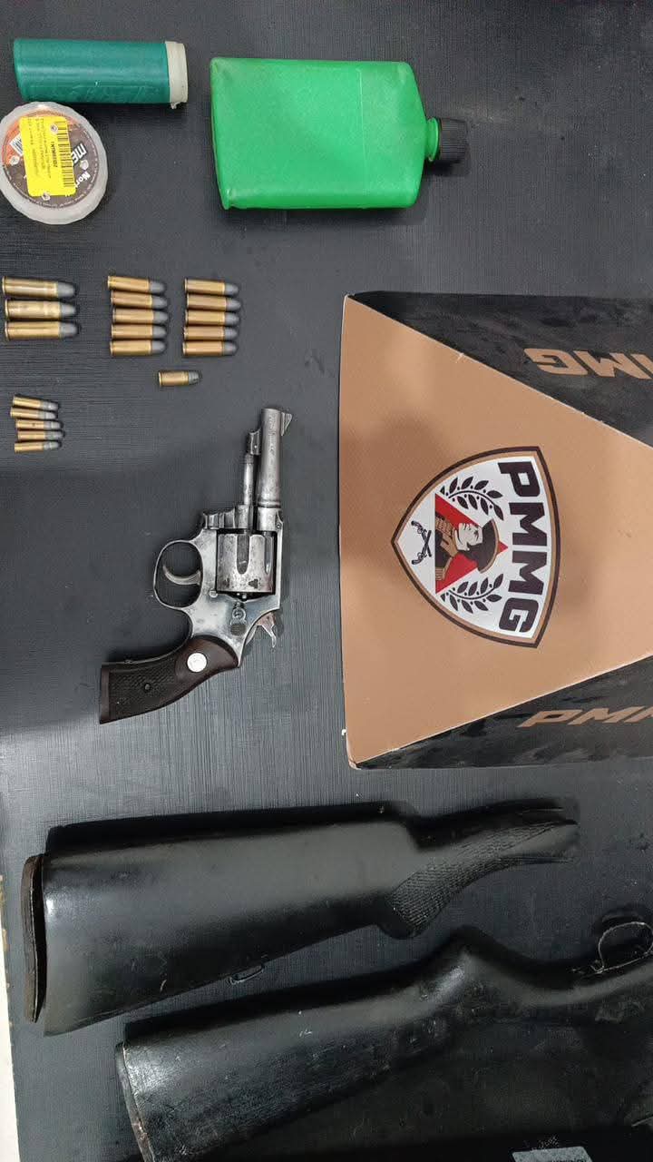 No local, durante as buscas, os militares localizaram um fundo falso em um armário da cozinha. No esconderijo, foi encontrado um revólver calibre .32, além de munições de diversos calibres, pólvora, espoletas e outros insumos para recarga.