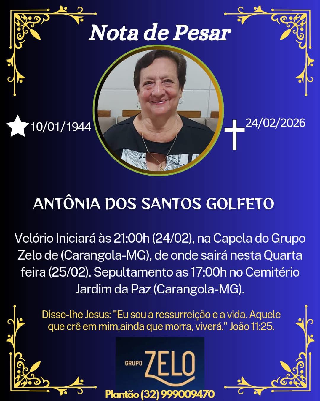 Sem categoria FALECEU ANTÔNIA DOS SANTOS GOLFETO, DE CARANGOLA 24 de fevereiro de 2026 0 Post Views: 0