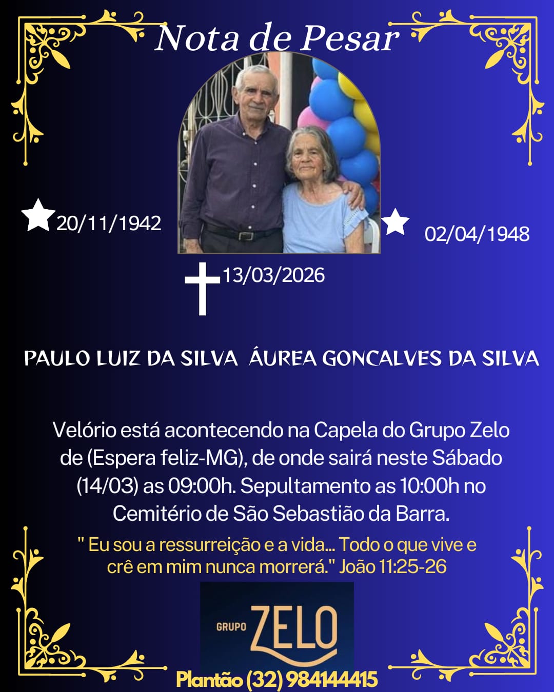 A despedida do senhor Paulo Luiz da Silva e da senhora Áurea Gonçalves da Silva, ocorreu nesta sexta-feira, 13 de março de 2026, sendo que o primeiro a partir para a eternidade foi o senhor Paulo, que estava internado no Hospital Casa de Caridade, em Carangola, por volta das 3:00 horas da madrugada.