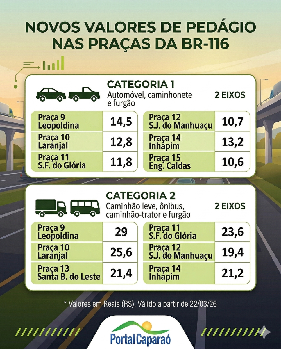 Para veículos de passeio, as tarifas passam a variar entre R$ 9,70 e R$ 21,00, conforme a praça de pedágio. Os valores das demais categorias seguem a tabela homologada pela ANTT.
