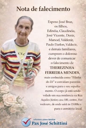 Esposo José Braz os filhos Valdemir, Valdecir, Manoelzinho, Claudinha, as filhas Edinéia e Claudinha, Paulo , Dení e demais familiares,cumprem doloroso dever de comunicar o falecimento de Therezinha Ferreira Mendes e convidam parentes e amigos para seu sepultamento.