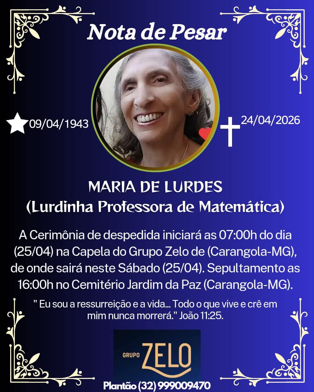 Sem categoria FALECEU MARIA DE LURDES (PROFESSORA DE MATEMÁTICA – A LURDINHA ) DE CARANGOLA 25 de abril de 2026 0